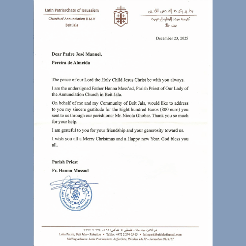 Desde há muito anos que o Nicola Ghobar nos visita com peças de artesanato em madeira de oliveira de Belém. O valor recolhido é enviado para diversas instituições da Palestina, apoiando as frágeis comunidades cristãs da Terra Santa.