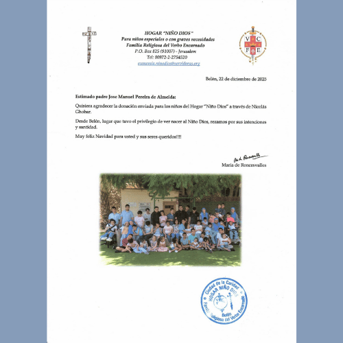 Exemplo do agradecimento que nos chega são estas duas cartas: uma da Paróquia e outra de uma Obra para crianças.